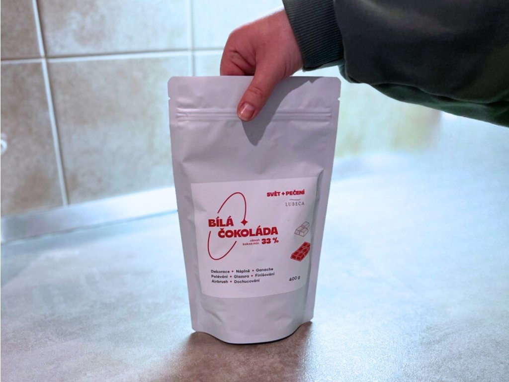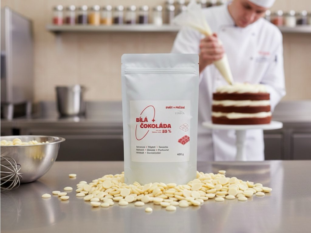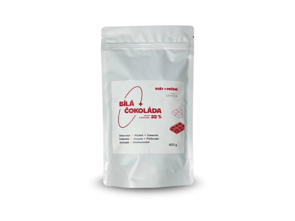 Čokoláda bílá 33 % v praktickém balení 400 g, s přesnou krystalizační křivkou, min. 33 % kakaové sušiny, skladování v pokojové teplotě mezi 18 °C až 21 °C, možné stopy ořechů.