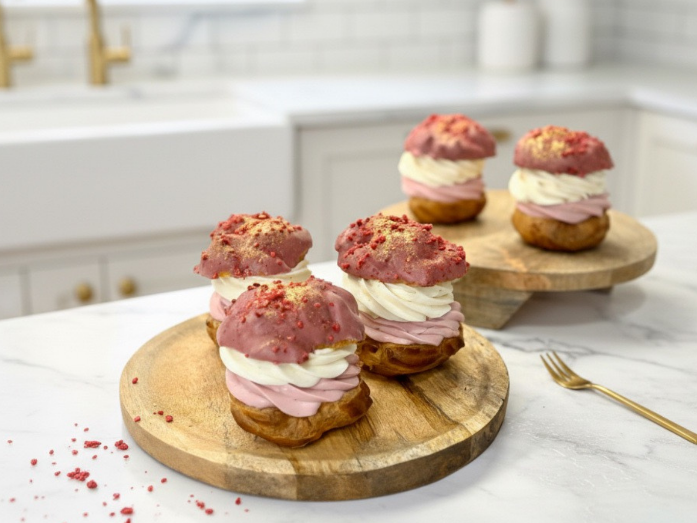 Tohle je recept na domácí větrníčky, které jsou lehké jako obláček, uvnitř malinově šťavnaté a nahoře mají „cukrárenský“ wow efekt díky ruby čokoládě a zlatému prachu. Vypadá to složitě, ale jakmile zvládnete odpalované těsto, zbytek už je čistá radost. A ano – maliny + šlehačka + odpalované těsto = kombinace, na kterou se nezapomíná. 😄