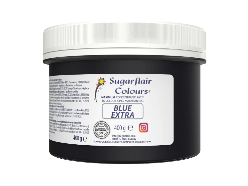 Blue Extra je vysoce koncentrovaná potravinářská gelová barva od značky Sugarflair, které postačí opravdu jen malé množství k dosažení sytého modrého odstínu.