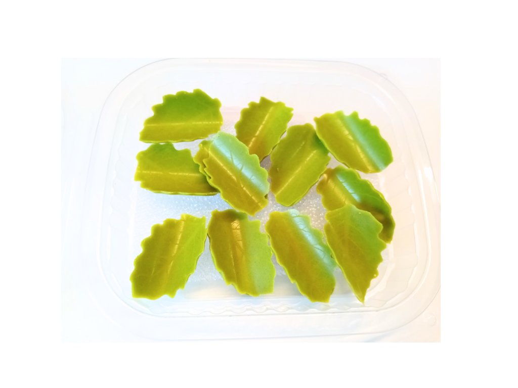 Čokoládová dekorace z bílé čokolády ve tvaru zahnutého zeleného listu. Rozměr 33 × 19 mm, přírodní barviva, balení 12 ks, vhodné pro zdobení dezertů.
