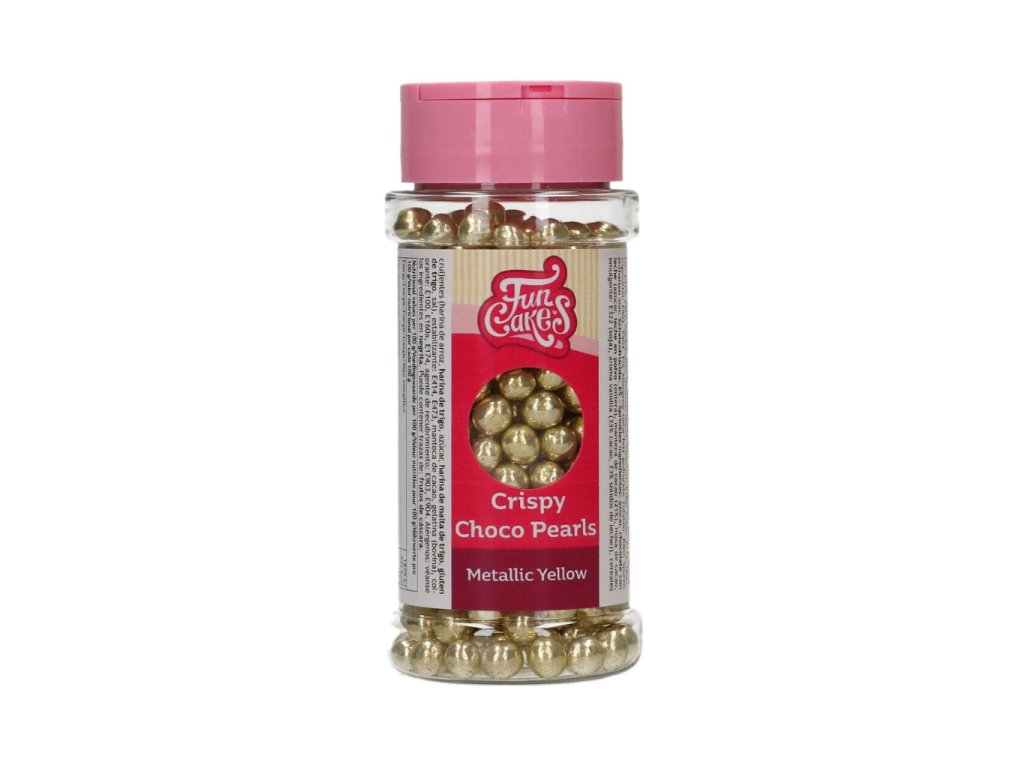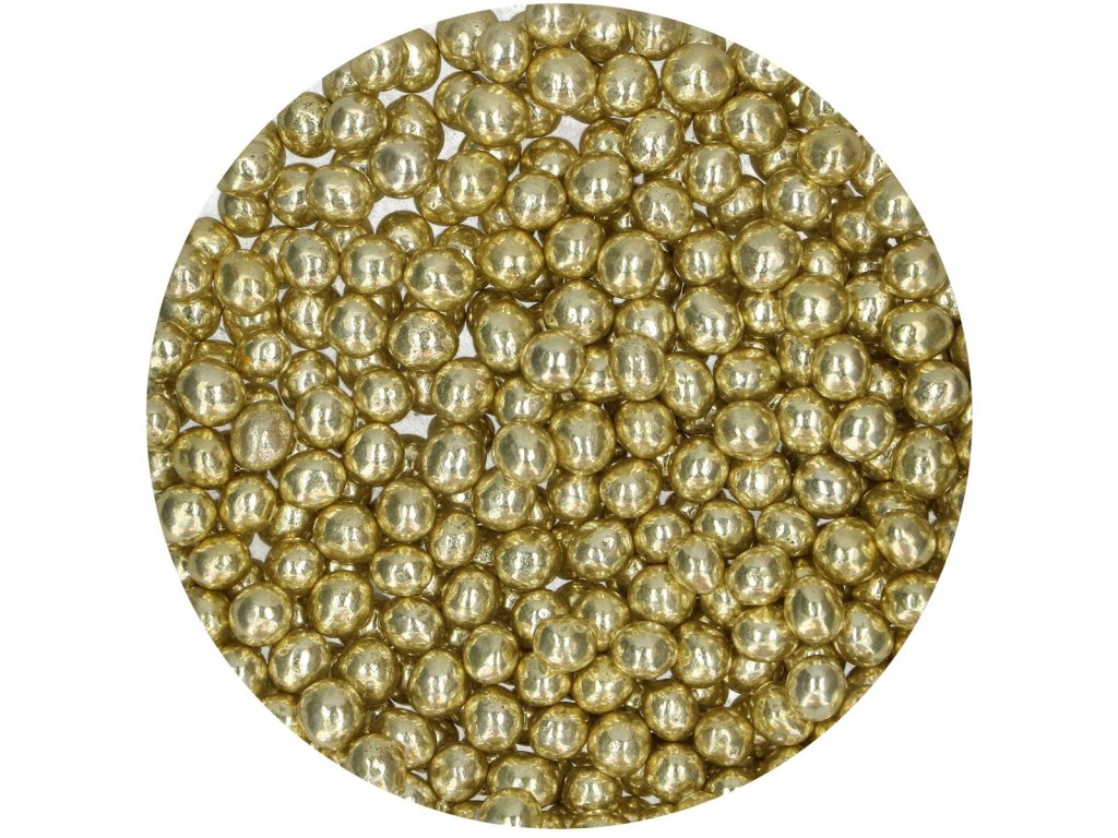 Čokoládové perly, balení 60 g, metalická žlutá barva, extra křupavé, vhodné na zdobení dortů, cupcaků, dezertů i zmrzliny.