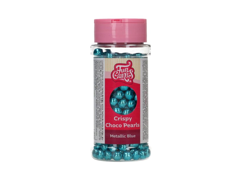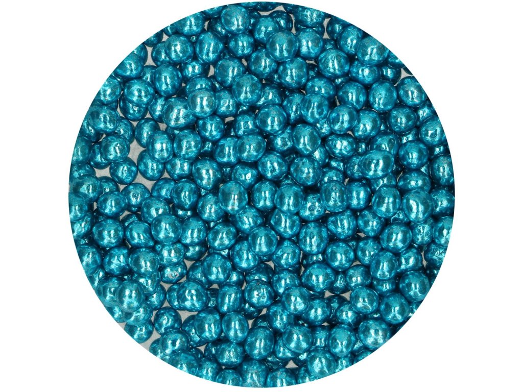 Čokoládové perly, balení 60 g, metalická modrá barva, extra křupavé, vhodné na zdobení dortů, cupcaků, dezertů i zmrzliny.