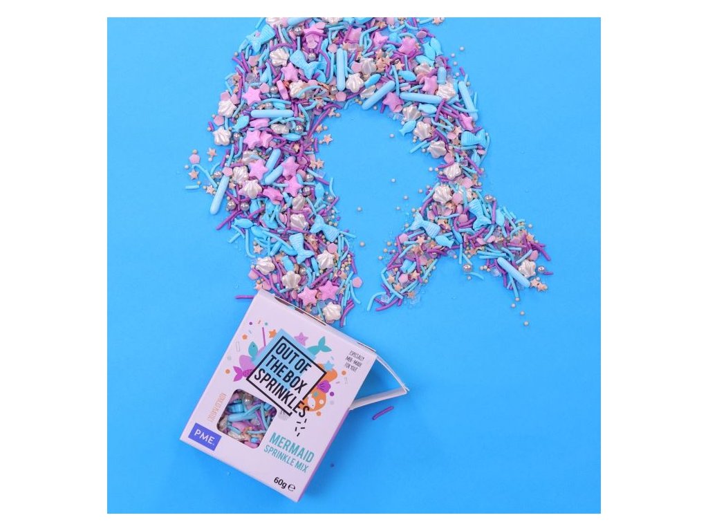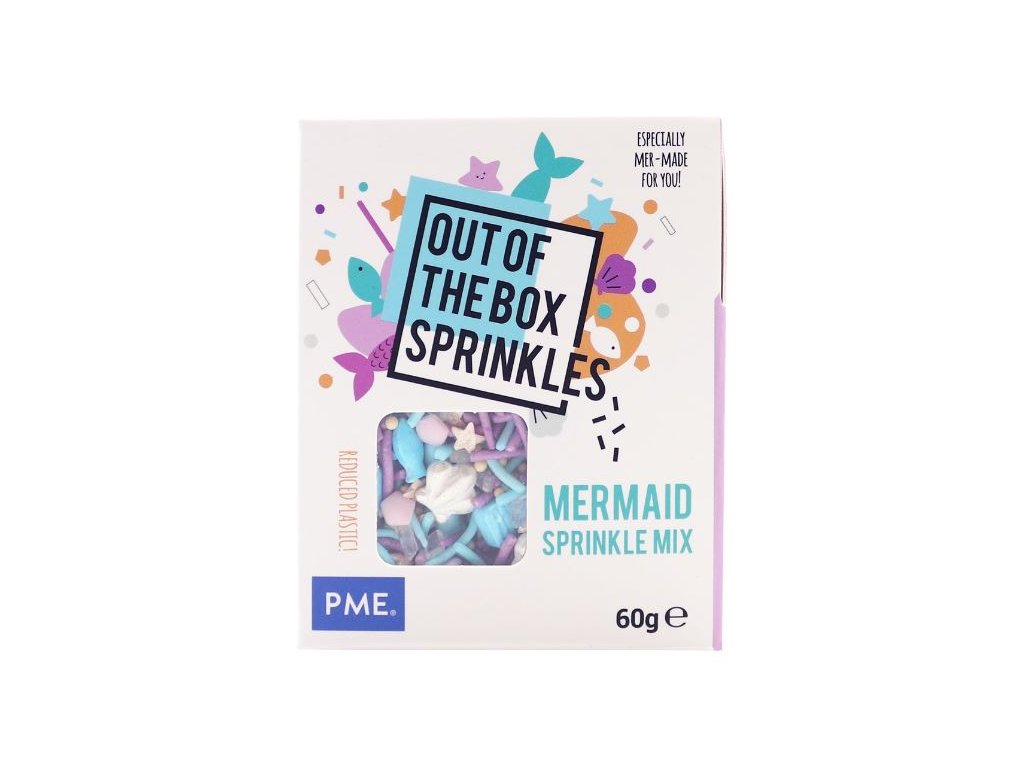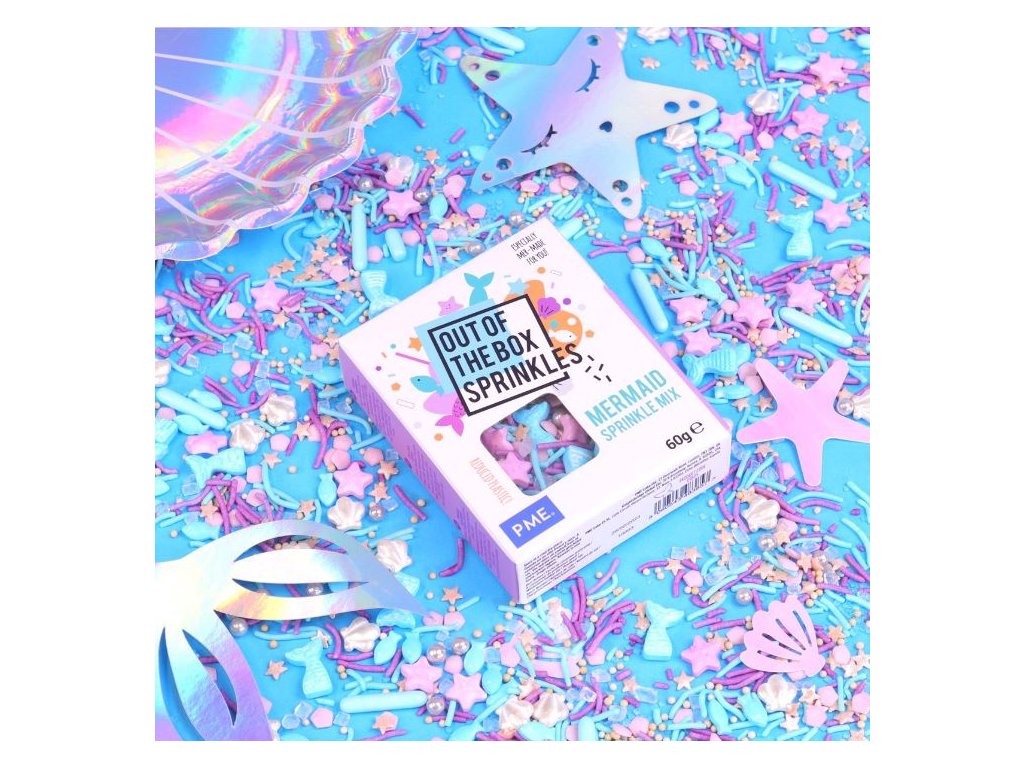 Cukrová dekorace PME Mermaid 60 g, směs cukrových ozdob s mořskou tématikou, snadné použití, znovuuzavíratelná krabička, bez AZO barviv.