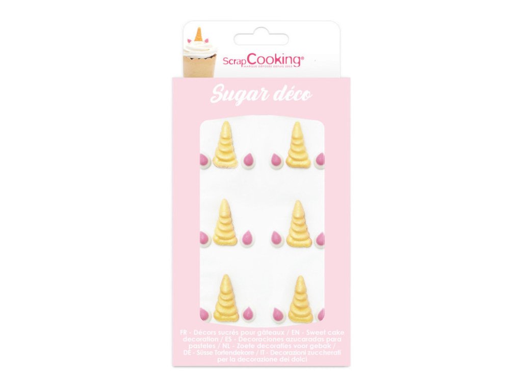 Jednorožčí ozdoba z cukru, hmotnost 6 g, 6 rohů + 12 oušek, z cukru, barveno přírodními koncentráty, na zdobení dortů a cupcakes.