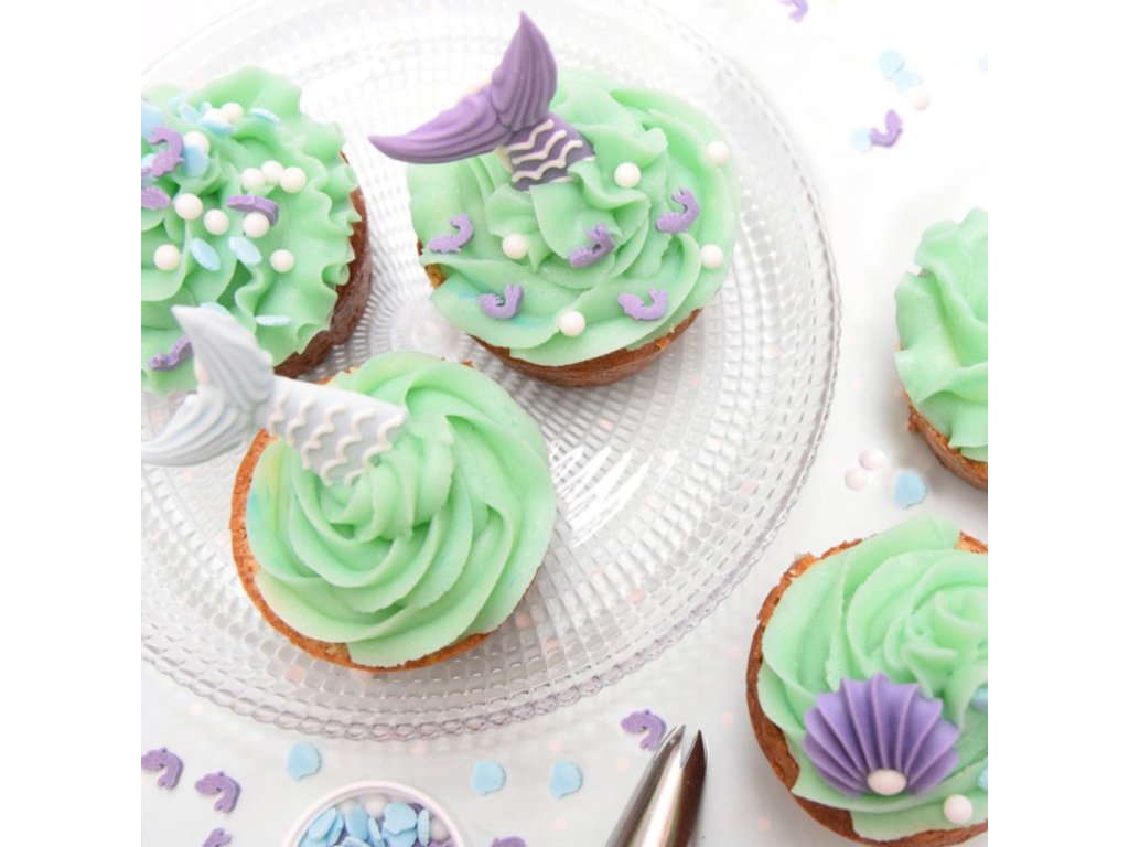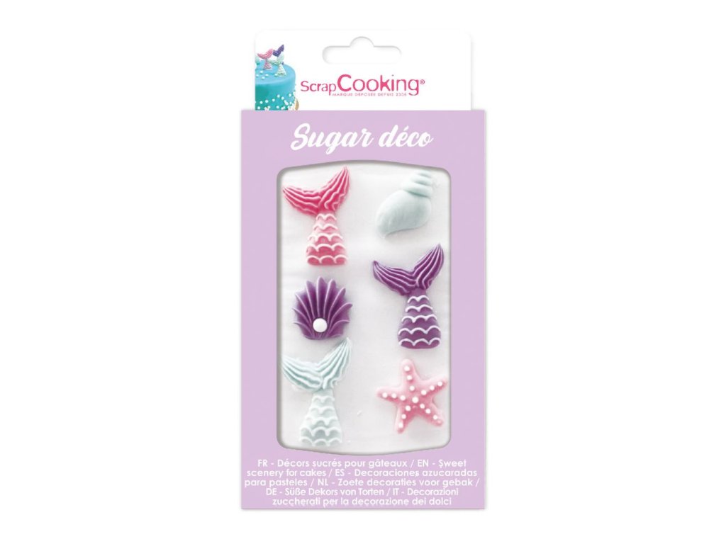 Ozdoby z cukru, 6 ks, netto 15 g, různé tvary (ocásky, mušle, hvězdice), rozměry 2,2–5 cm, barveno přírodními koncentráty, vhodné na dorty a cupcakes.