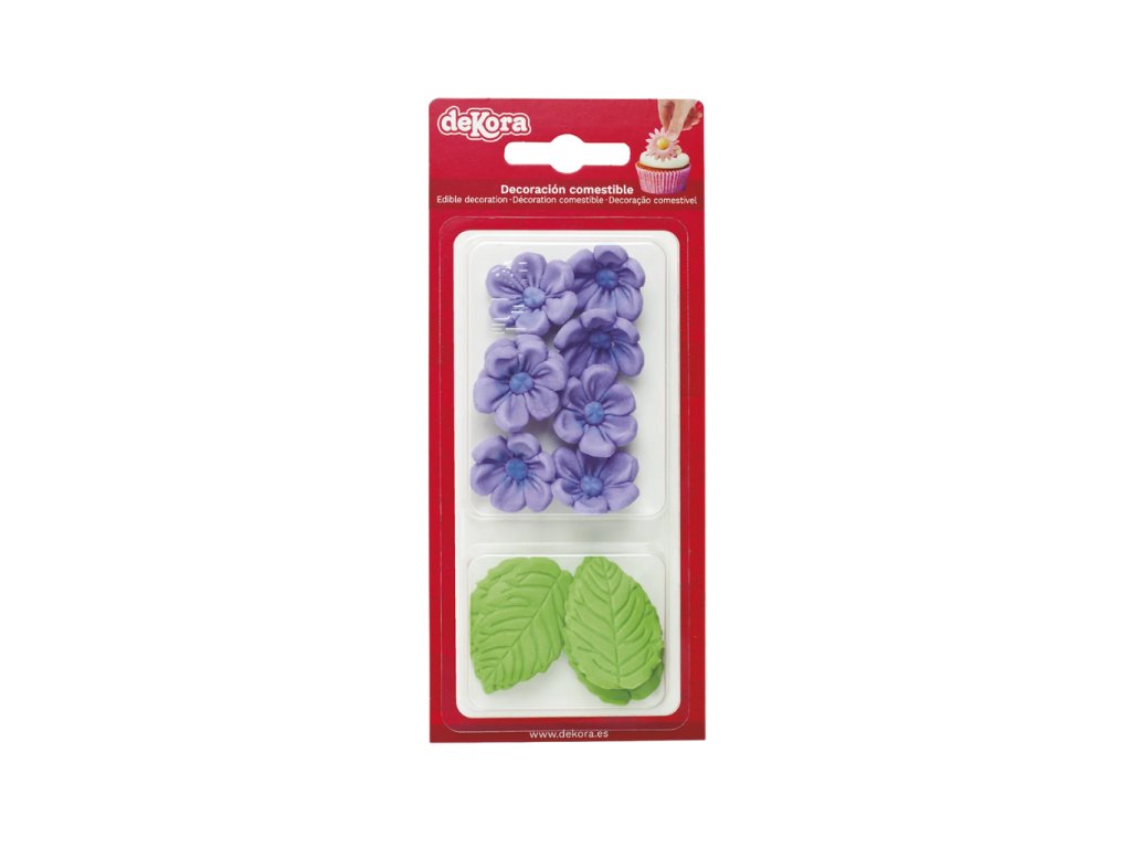 Hotové cukrové zdobení ve tvaru květů a listů určené k okamžitému použití. Sada obsahuje 8 fialových květů a 5 zelených listů, díky kterým bude váš dort či zákusek působit profesionálním dojmem.
