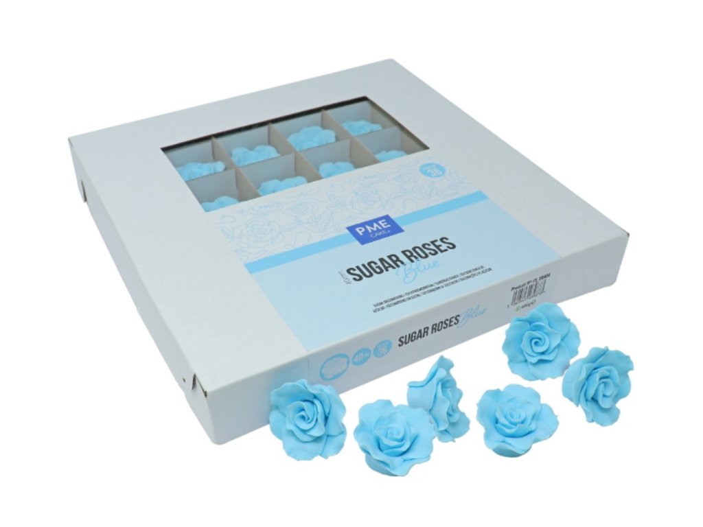 Modré cukrové růže o velikosti 4 cm, balení 36 ks. Ručně vyráběné dekorace na dorty, cupcakes a slavnostní dezerty.