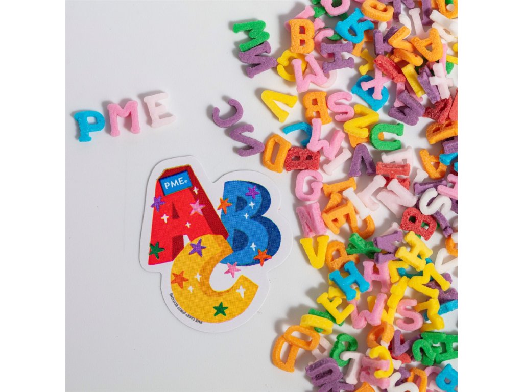 Dekorativní cukrové sypání ve tvaru barevných písmen. Mix barev, hmotnost 25 g. Určeno pro zdobení dortů, cupcakes a dezertů.