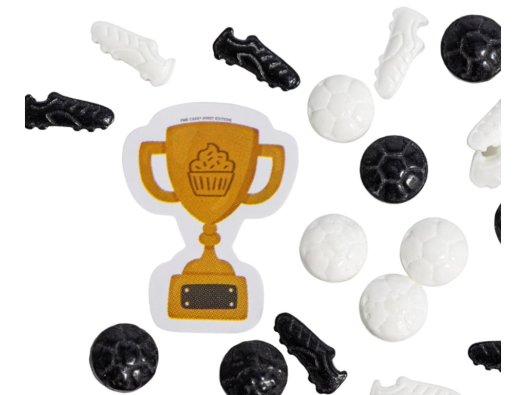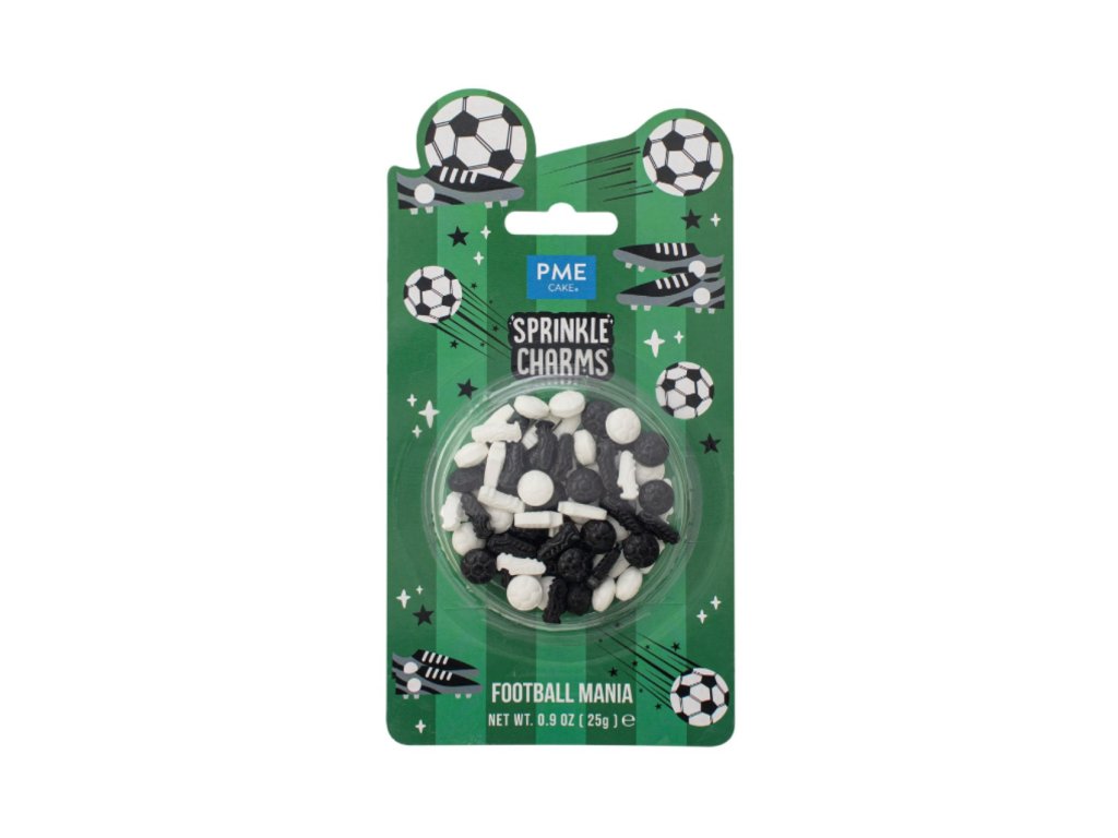 Cukrové sypání Fotbal od PME je tematický mix cukrových dekorací ve tvaru fotbalových míčů a kopaček v černo-bílém provedení. Toto zdobení je ideální pro narozeninové dorty malých i velkých fotbalistů a tematické cupcaky nebo sušenky.