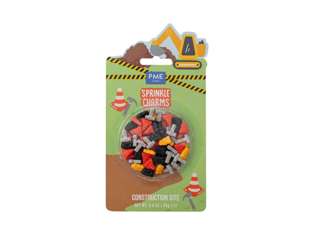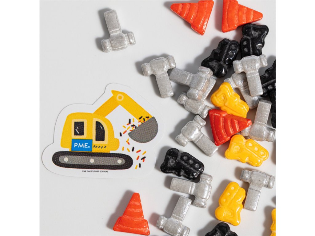 Dekorativní cukrové sypání, tvar kladiva, kuželu a bagru, barva žlutá, oranžová, stříbrná a černá, hmotnost 25 g. Určeno pro zdobení dortů, cupcakes a dezertů.