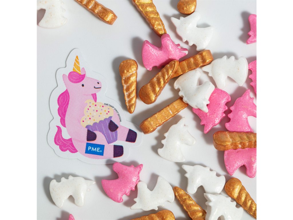 Mix bílých a růžových jednorožců a zlatých rohů, hmotnost 25 g. Určeno pro zdobení dortů, cupcakes a dezertů.