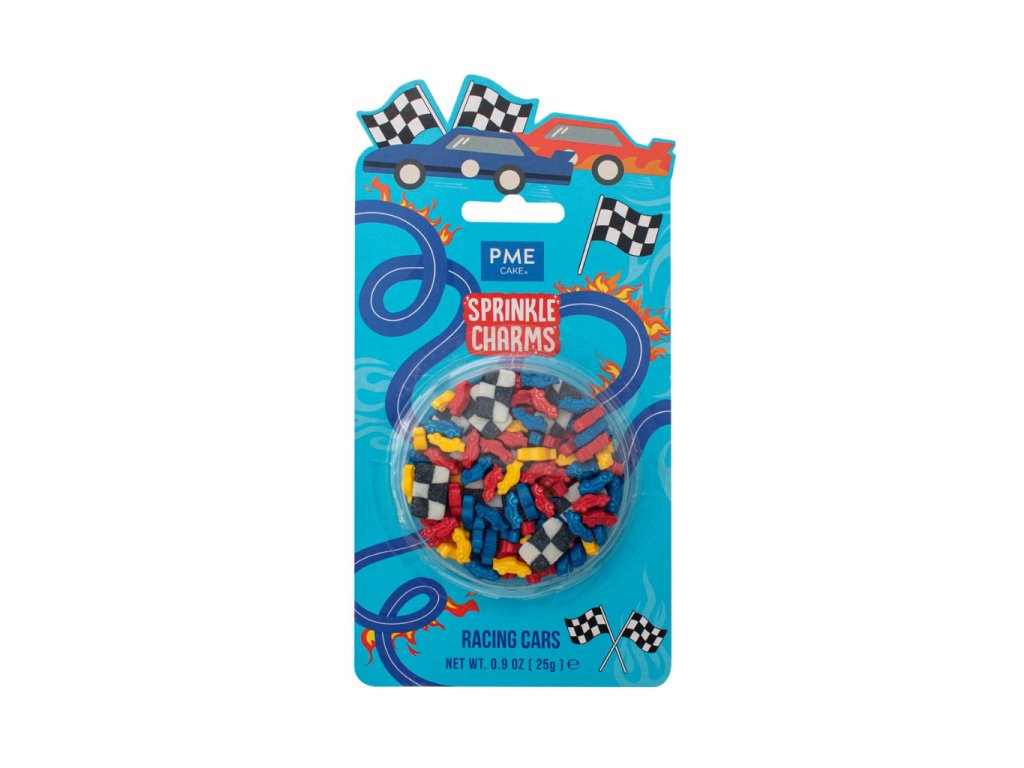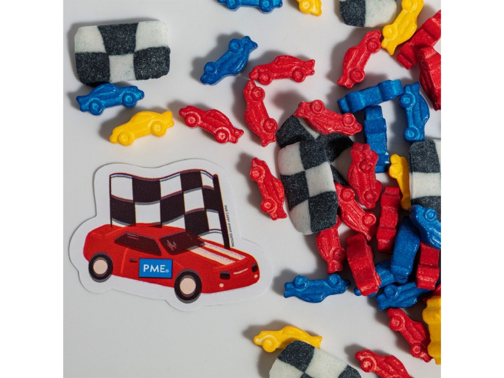 Dekorativní cukrové sypání s motivem závodních aut. Mix tvarů a barev, hmotnost 25 g. Určeno pro zdobení dortů, cupcakes a dezertů.