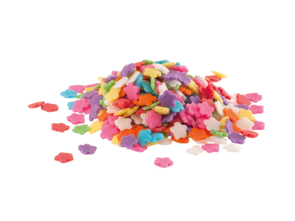 Cukrové sypání ve tvaru hvězdiček, mix barev, jemná struktura, balení 100 g. Určeno pro zdobení dortů, cupcakes a dezertů.