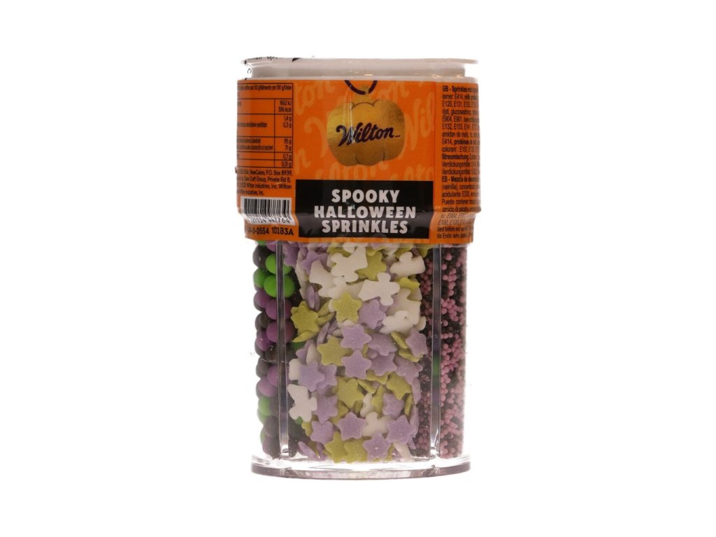 Cukrové sypání děsivý Halloween promění vaše cupcakes, dorty i sušenky během chvilky. Čtyřkomorový otočný dávkovač spojuje bílé duchy, černo-fialové nonpareils, mix duchů a hvězd a černo-zeleno-fialové cukrové perly – stačí pootočit víčkem a sypat.