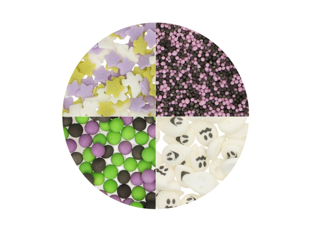 - Složení setu: bílé duchy; černo-fialové nonpareils; mix duchů a hvězd; černo-zeleno-fialové cukrové perly