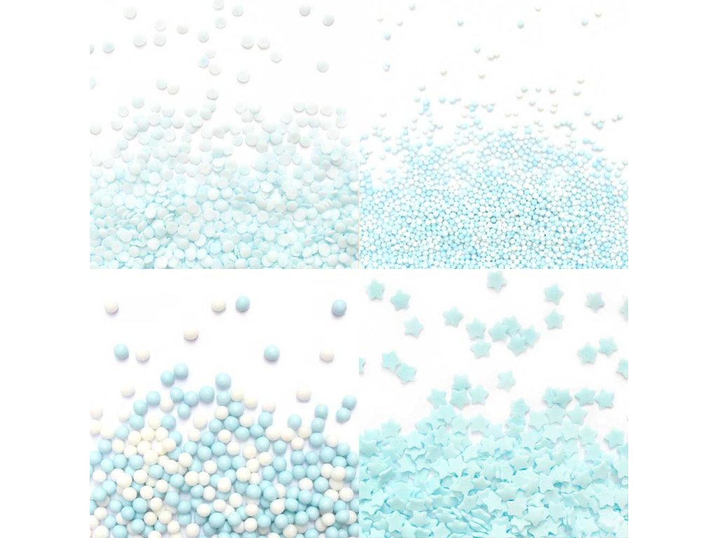 Obsah balení: modré konfety, modrobílé nonpareils, modrobílé perličky, modré hvězdy