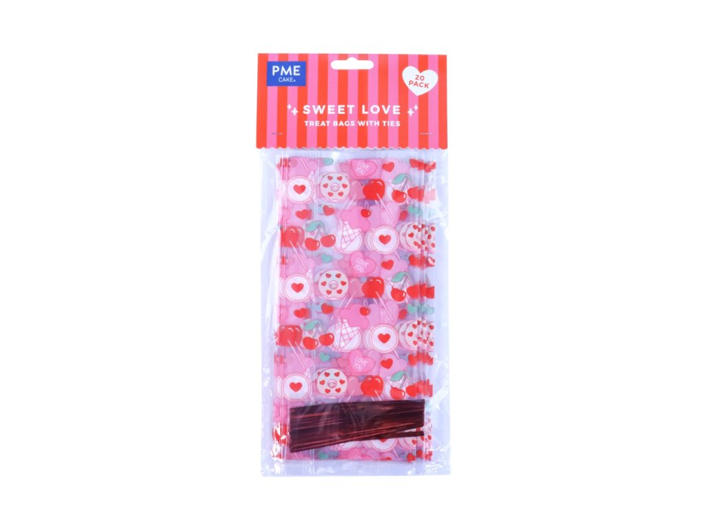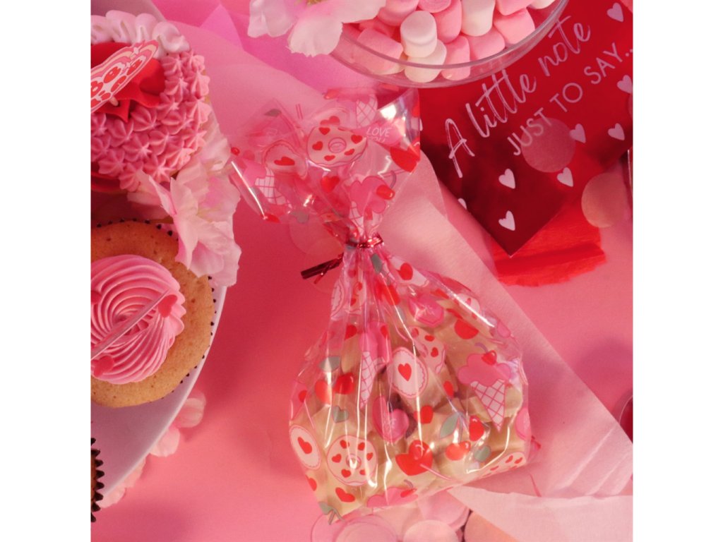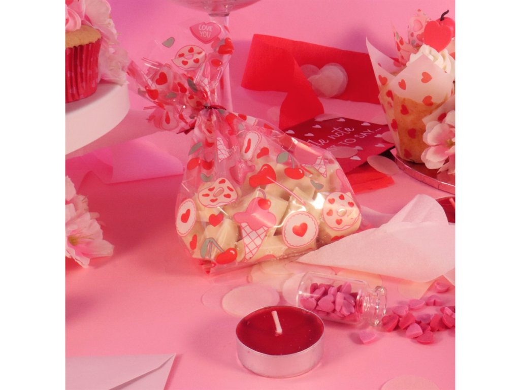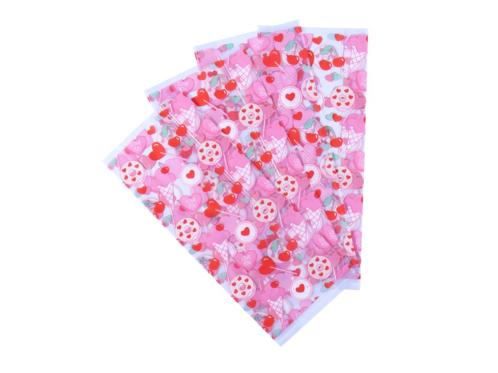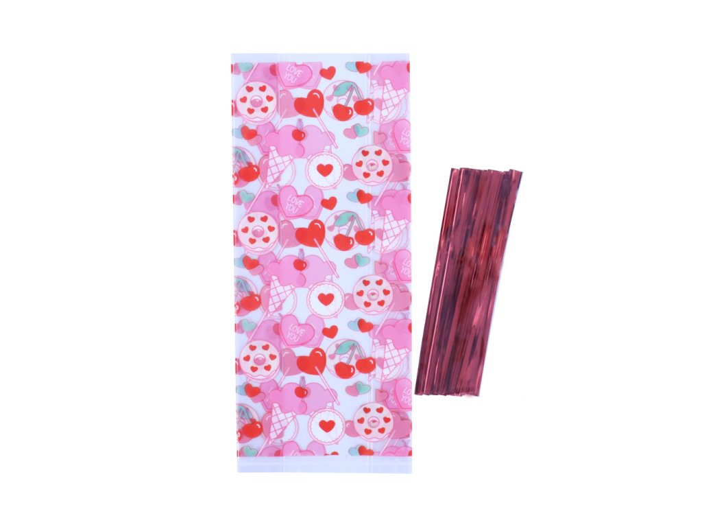 Dárkové sáčky na cukrovinky s valentýnským motivem lásky. Obdélníkový tvar, sada 20 ks. Vhodné pro balení sladkostí a drobných dárků.
