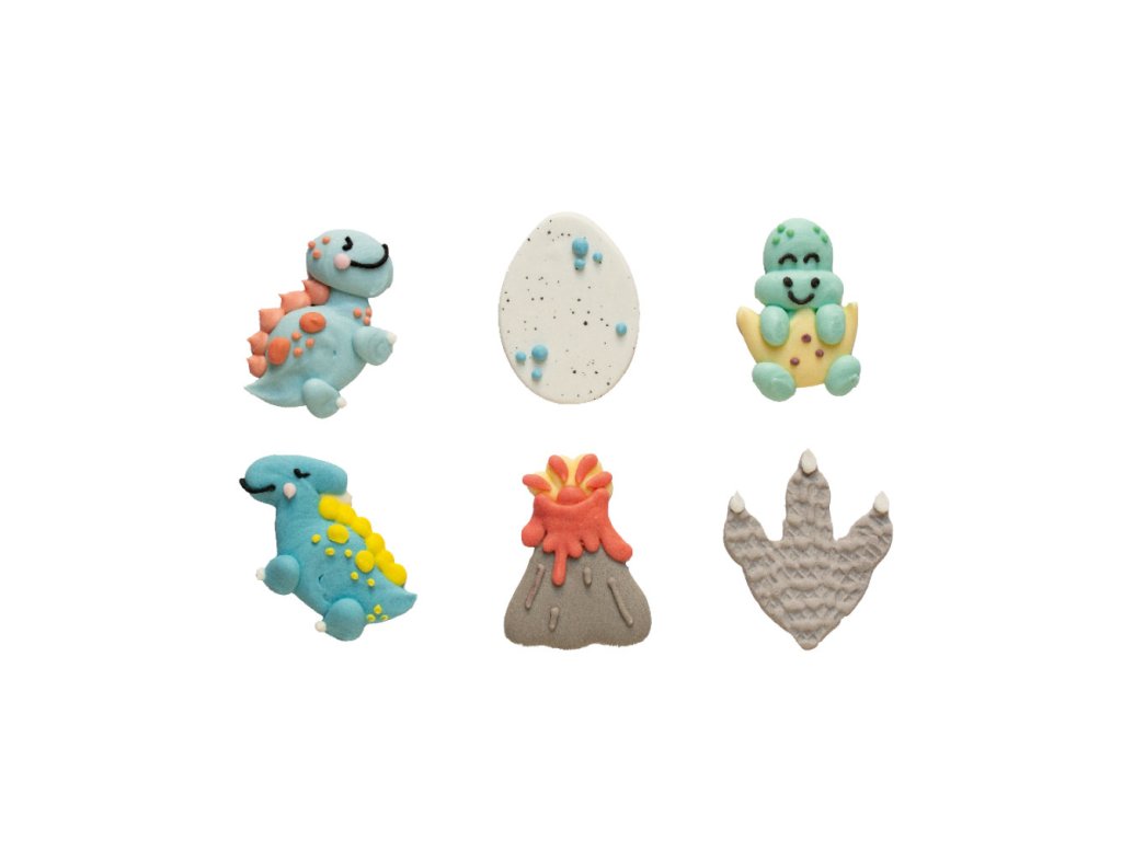 Ručně vyráběné cukrové ozdoby, motiv dinosaurů, 6 ks, rozměry 2,6 - 5 cm × 4 cm, přírodní barviva, křehké – skladujte v suchu a chladu.
