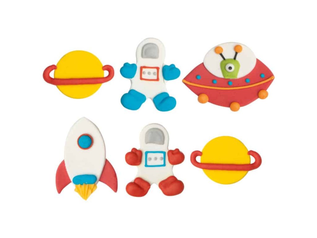 Dekorace z cukru, motiv vesmír (astronaut, planeta, raketa, ufo), balení 6 ks, jedlé cukrové ozdoby pro tematické dorty, sušenky a cupcaky.