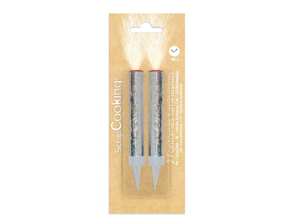 Fontána do dortu, 2 ks v balení, výška 12 cm, efekt ohňostroje, interiérové použití, pyrotechnika kategorie F1.