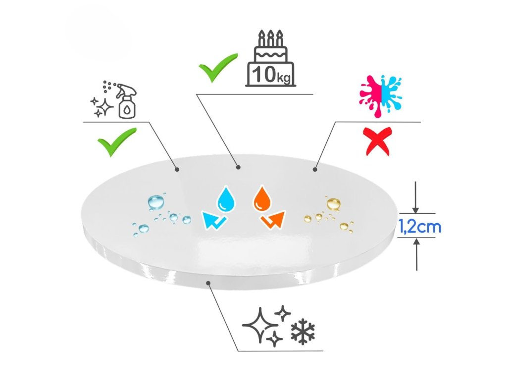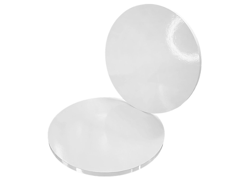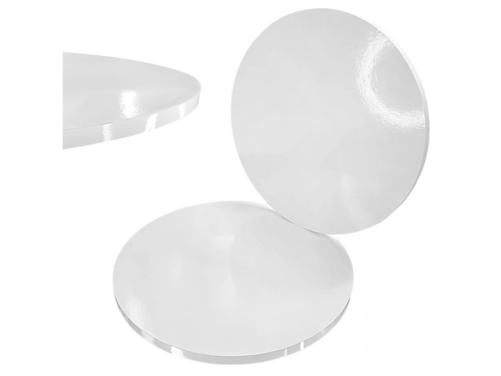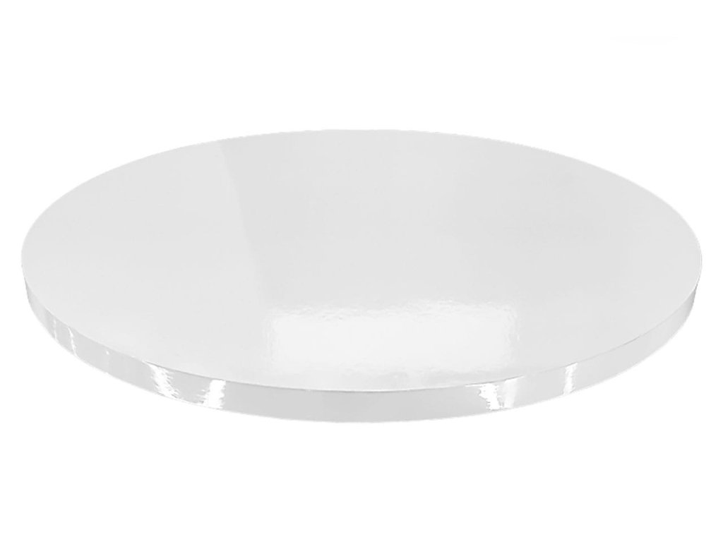 Kulatá podložka pod dort, průměr 30 cm, výška 1,2 cm, barva bílý lesk, pro dorty do 10 kg, velmi pevná, odolná proti vodě a tuku, potravinářská úprava.