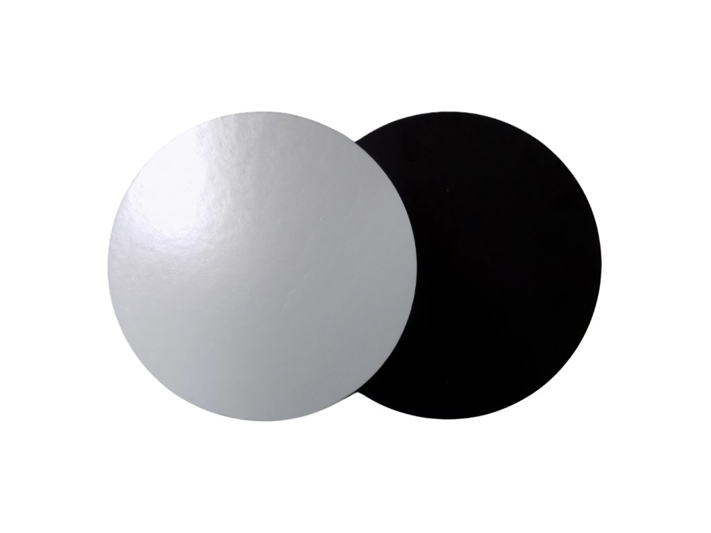 Dortová podložka z pevného kartonu potaženého fólií, oboustranné provedení (bílá/černá), kulatá, průměr 20 cm, tloušťka 3 mm, vhodná pro prezentaci dortů.