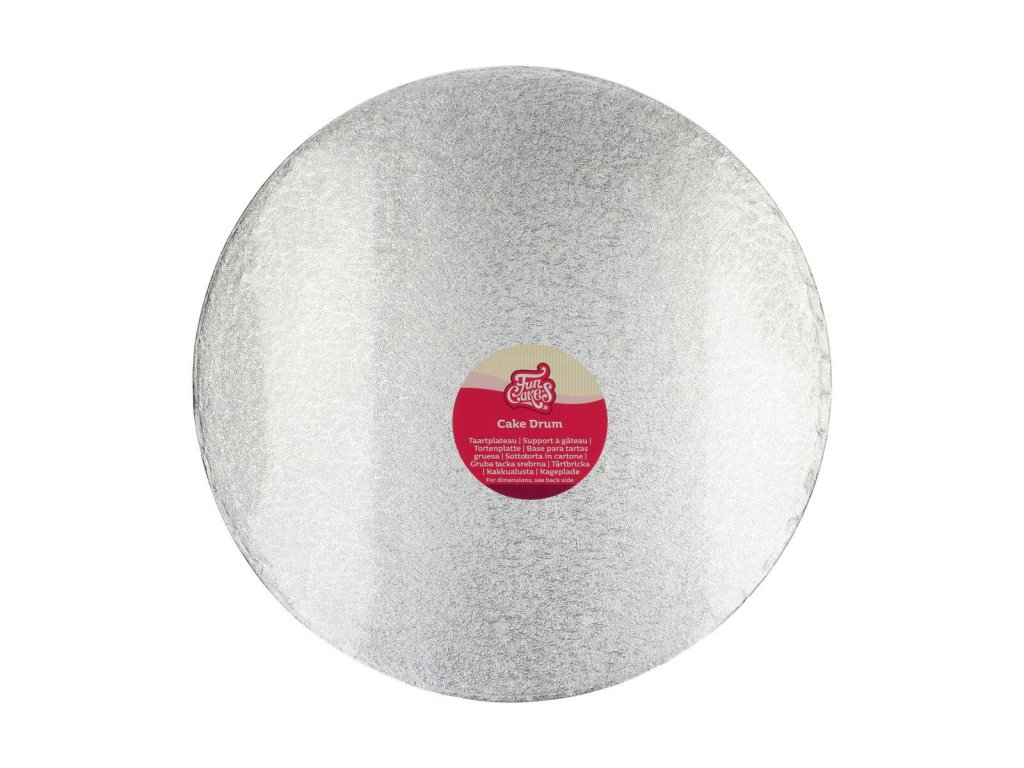 Průměr podložky 40,5 cm, výška 12 mm, barva stříbrná, pevná konstrukce, elegantní a znovupoužitelná podložka pro prezentaci dortů.