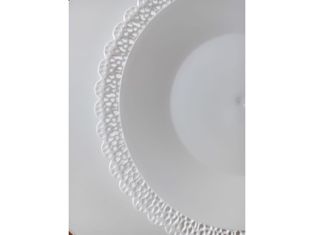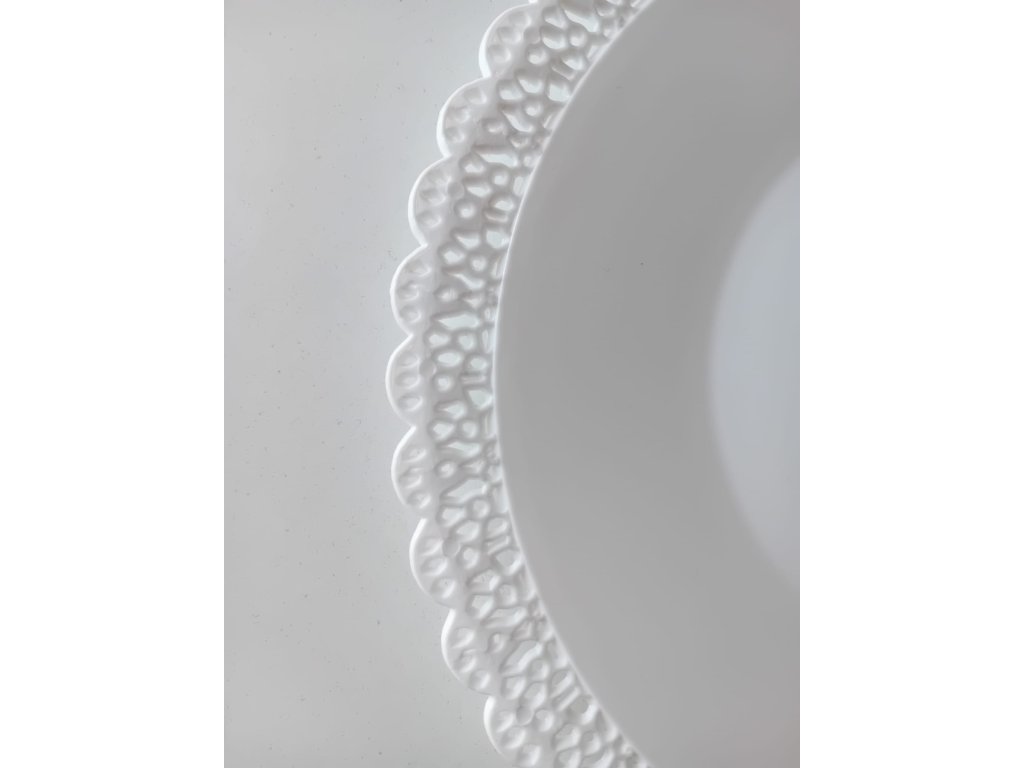 Průměr tácu 32 cm, bílý, výška 1 cm, plocha k použití 21,5 cm, velikost krajky 1,6 cm, plast vhodný pro kontakt s potravinami, opakované použití, 1 ks.