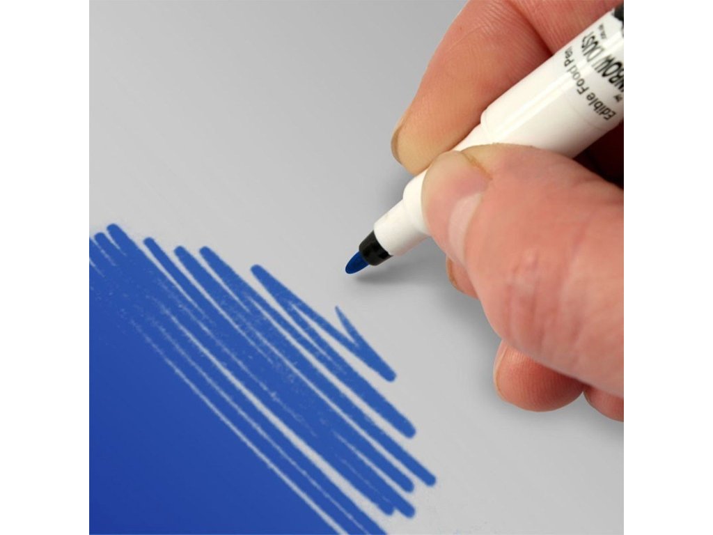 Cake Craft Pen (Food Art Pen) od Rainbow Dust lze použít na obou stranách s 0,5 mm tuhou na jedné straně a 2,5 mm tuhou na druhé straně. Díky dvěma stranám fixu jej můžete použít jak pro vybarvování, tak pro nanášení menších detailů, jako jsou oči, řasy na obličeji nebo žilky na listech a květech.