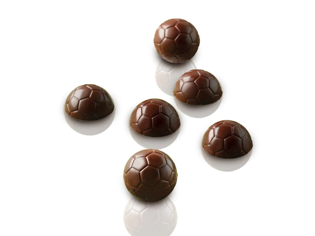 Kvalitní silikonová forma na výrobu čokoládových pralinek s motivem fotbalových míčů.