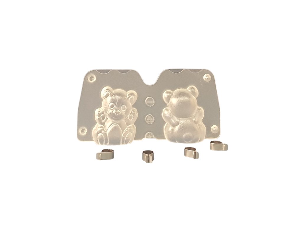 Forma na čokoládu - Medvěd "Bruno" 3D 80 g, velikost 90 × 74 × 60 mm, polykarbonát, dvojitá forma, 2 dutiny, rozměr formy 250 × 120 mm.