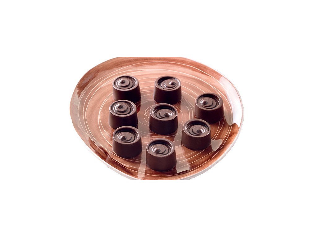 15 čokoládových pralinek ve tvaru kruhu s reliéfem.