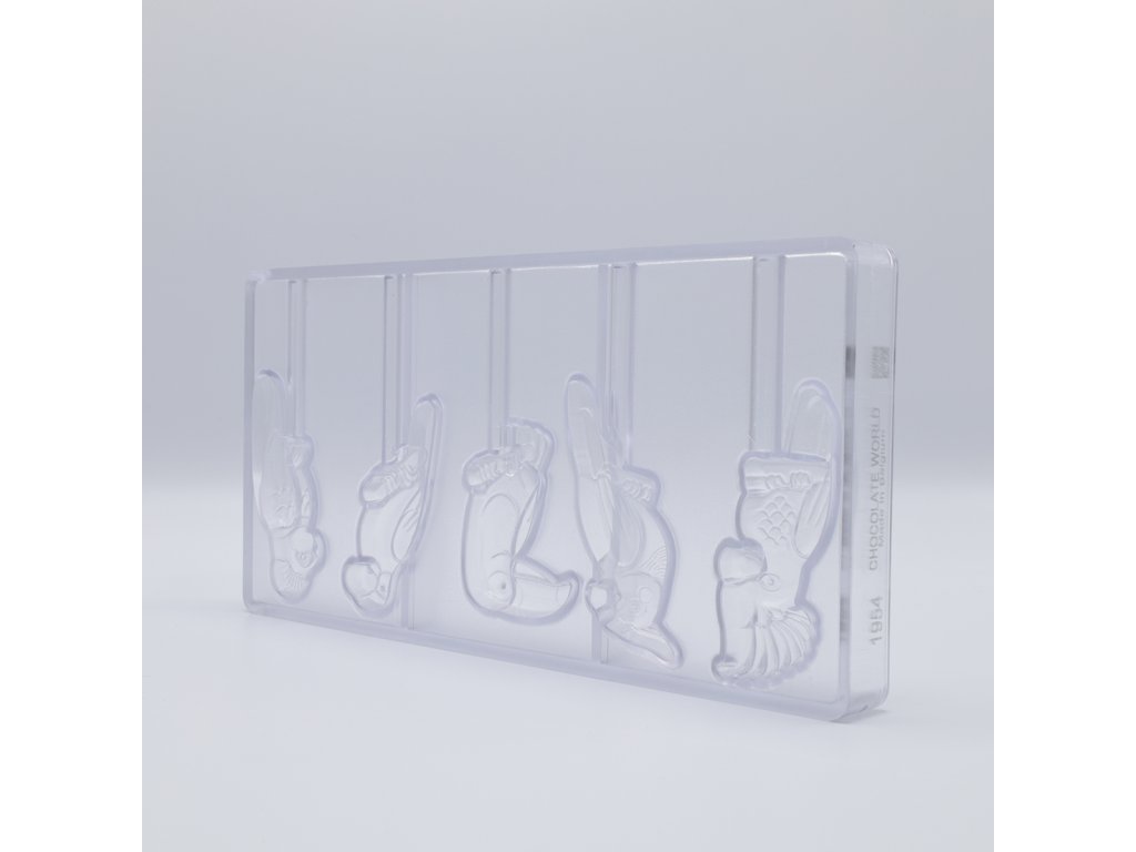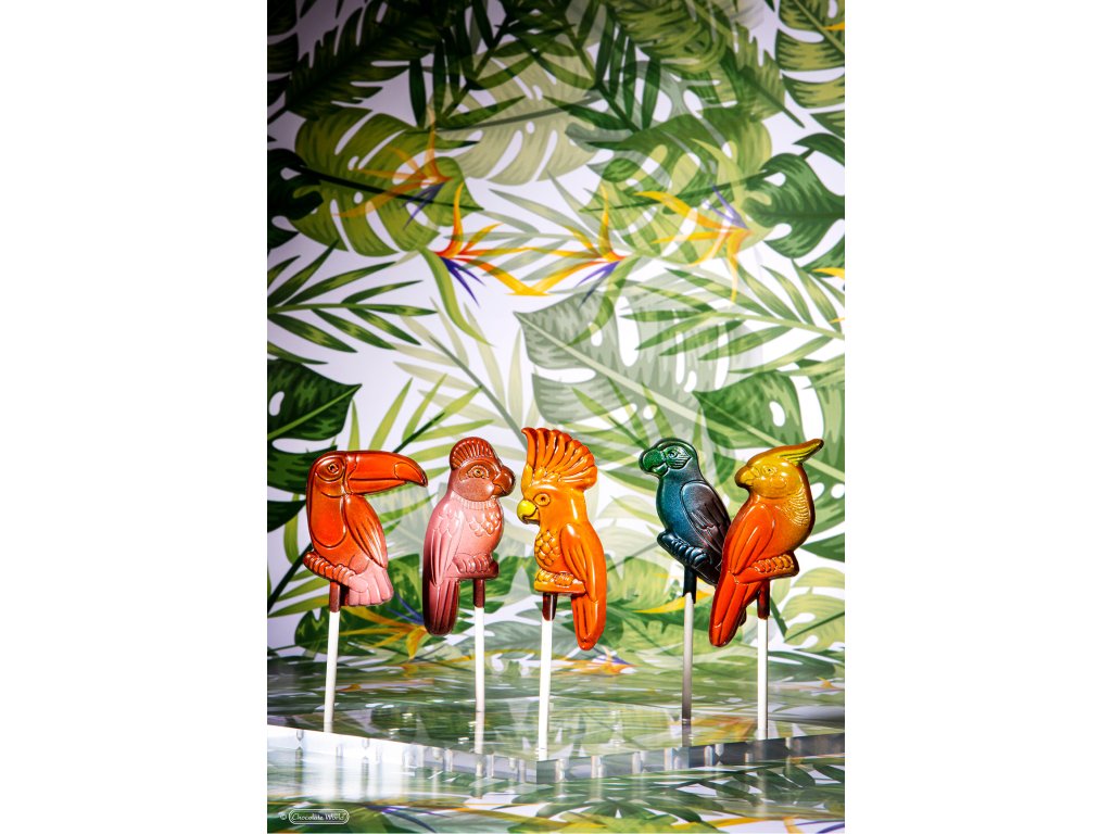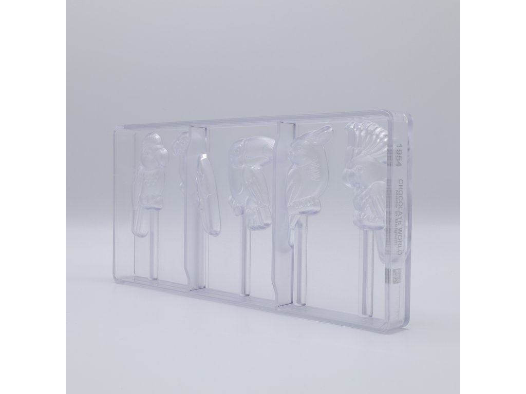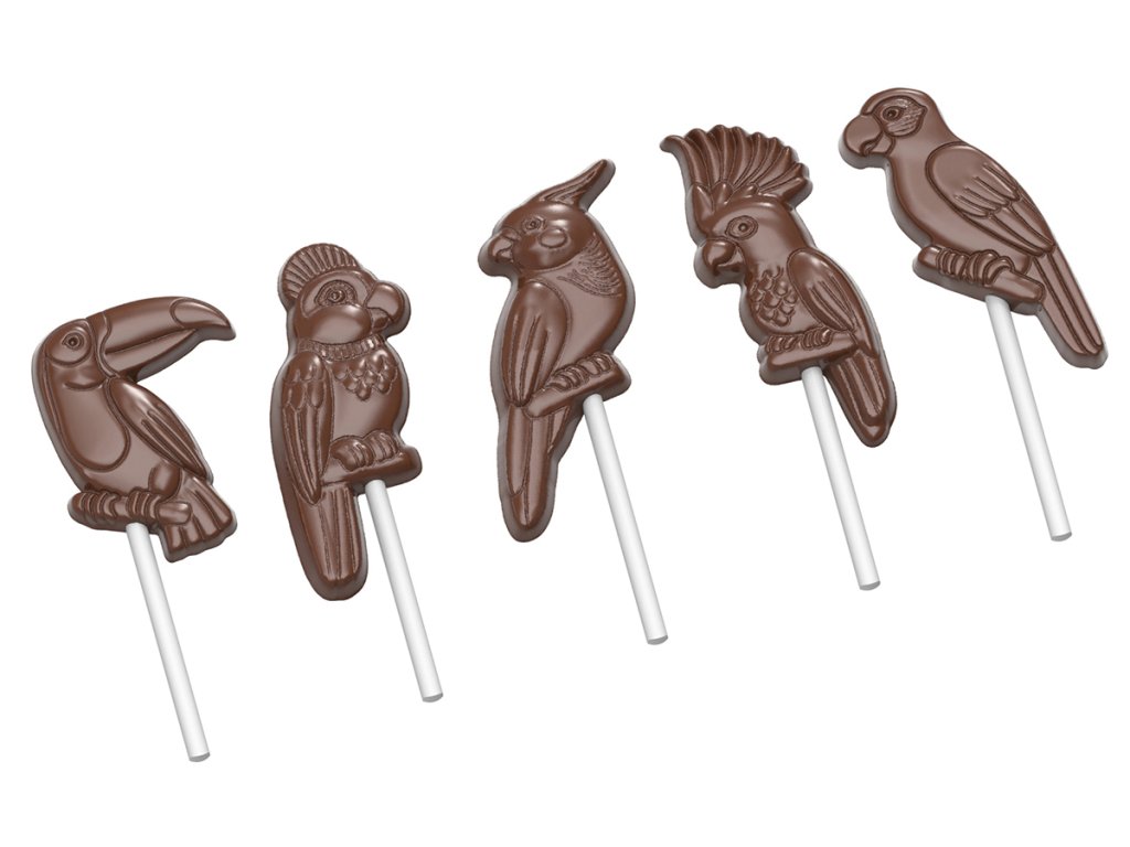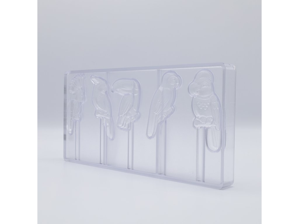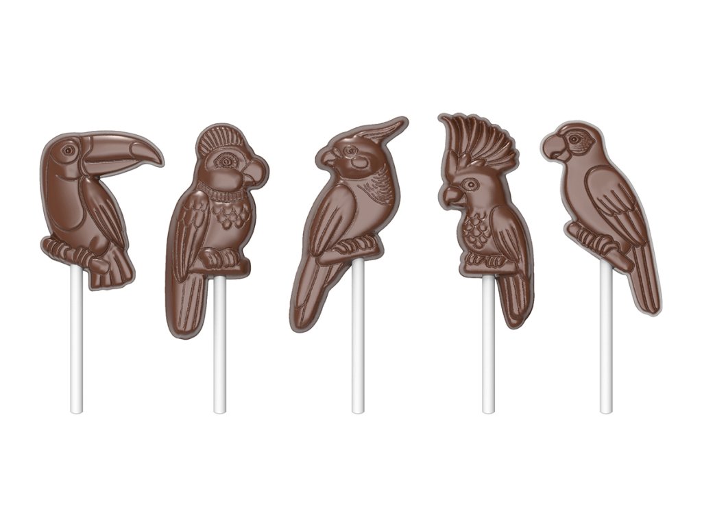 Forma na pralinky - lízátko papoušci, polykarbonátová forma, rozměry 275 x 135 x 24 mm, 5 druhů papoušků, hmotnost pralinky 16,5–17,5 g, počet lízátek 5 ks.