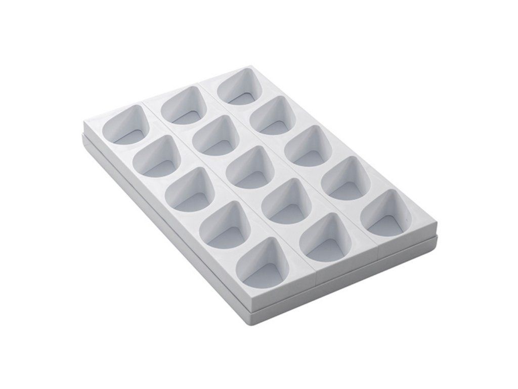 Tvar trojúhelník, rozměr formy 26 × 40 cm, kapacita 12 ks, objem jedné porce 150 ml, materiál plast, barva bílá.