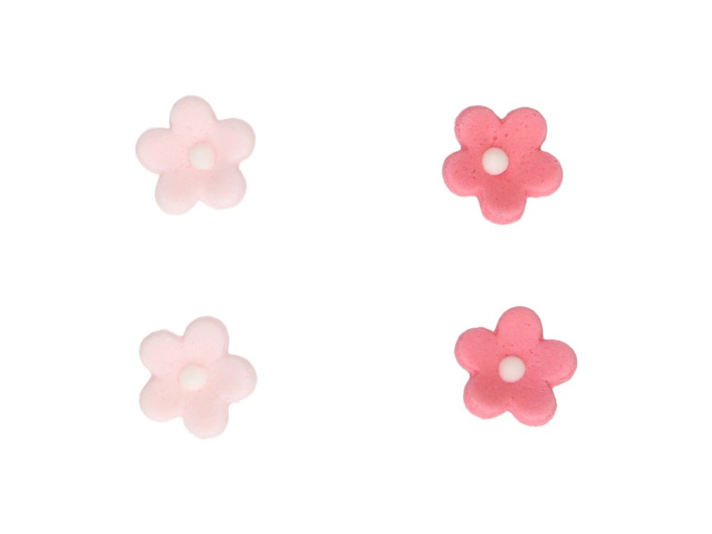 Cukrové dekorace, motiv květiny, barva růžová, balení 64 ks (32 tmavě růžových a 32 světle růžových), bez lepku, vhodné pro jarní a velikonoční dezerty, ideální na zdobení dortů, cupcaků i sušenek.