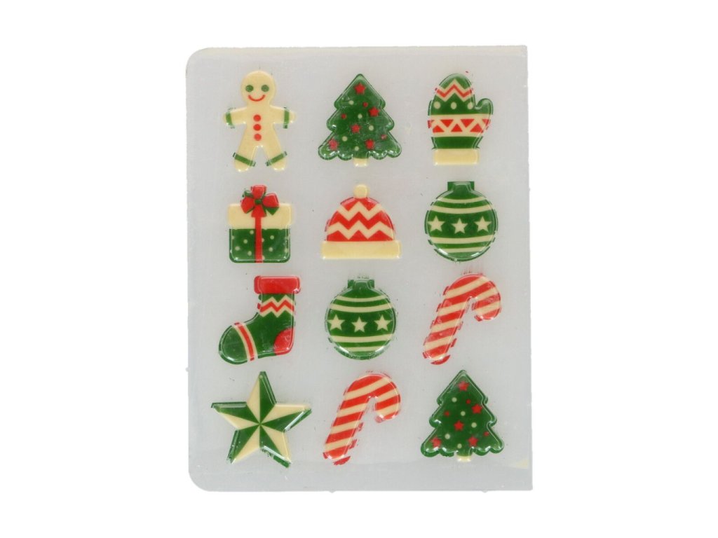 Dekorace z pravé belgické čokolády s vánočním motivem, balení 12 ks, motiv perníčku, rukavice, dárku, punčochy, hvězdy, stromečku, lízátka, baňky a čepice, ideální pro zdobení vánočních dezertů.
