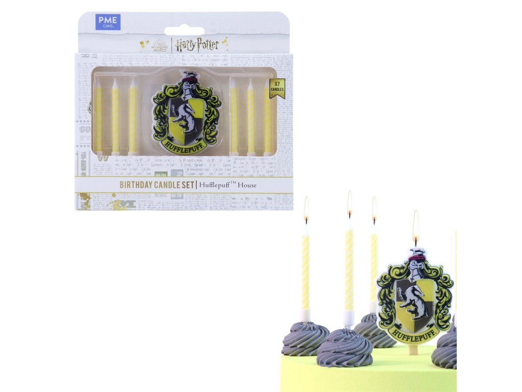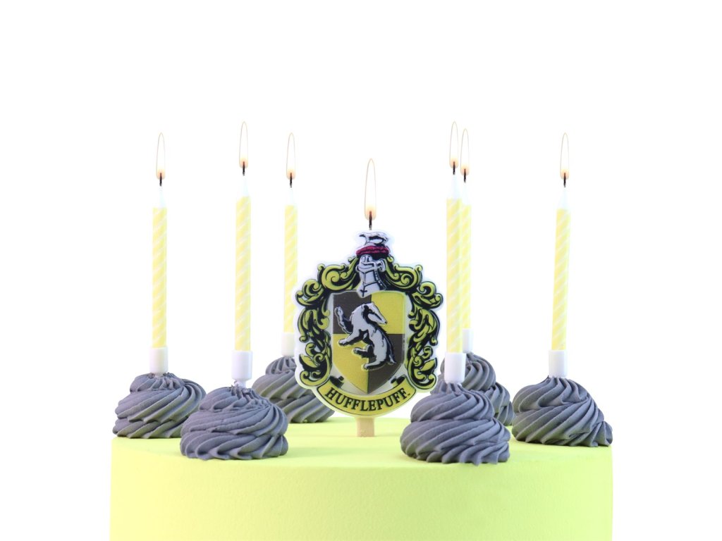 Rozměry erbové svíčky: 5,5 × 7 cm, výška pruhovaných svíček: 7 cm, motiv: Harry Potter – Mrzimor, balení 7 ks.