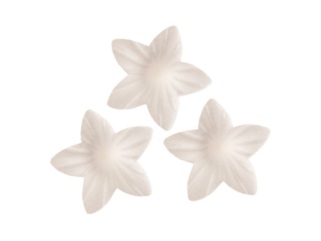 Dekorace z jedlého papíru, tvar květ, bílá barva, průměr 2 cm, balení 20 ks, bez lepku, laktózy a přidaného cukru, ideální na zdobení dortů nebo cupcaků.