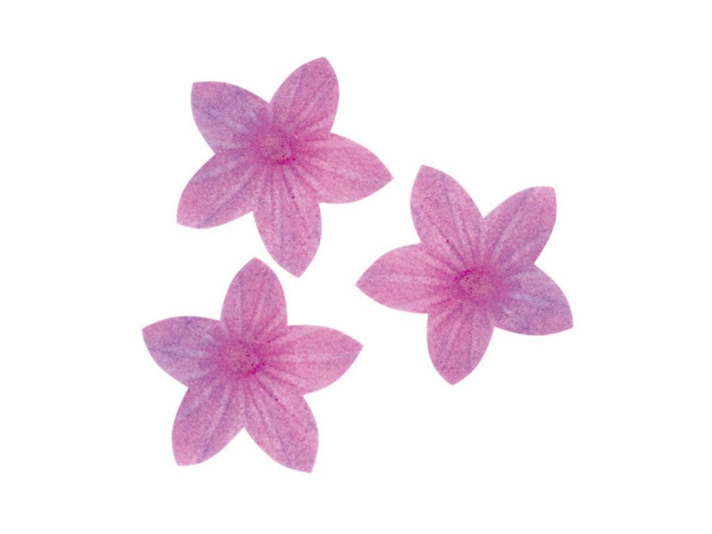 Dekorace z jedlého papíru, tvar květ, fialová barva, průměr 2 cm, balení 20 ks, bez lepku, laktózy a přidaného cukru, ideální na zdobení dortů nebo cupcaků.