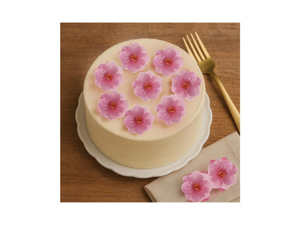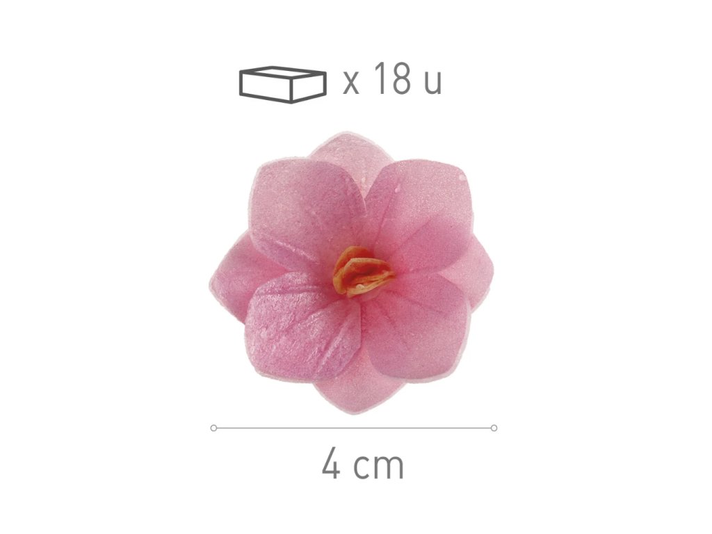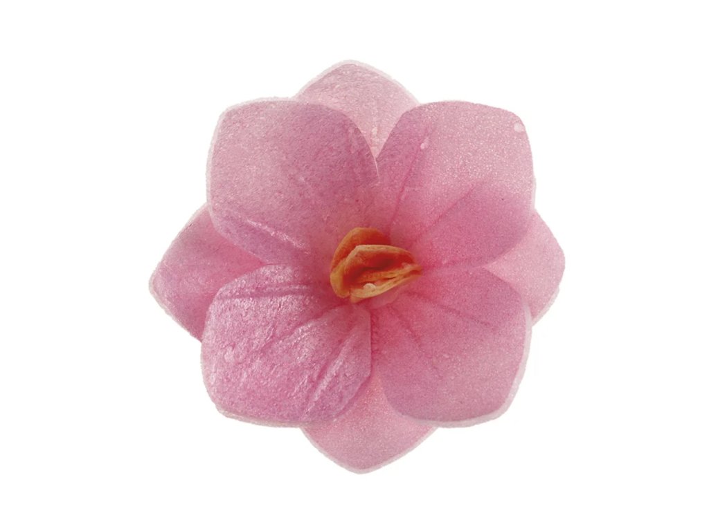 Jedlé květinové dekorace – květiny, 8 ks; průměr cca 4 cm; růžová barva; jedlý papír; hotové k použití na dorty, cupcakes a řezy.