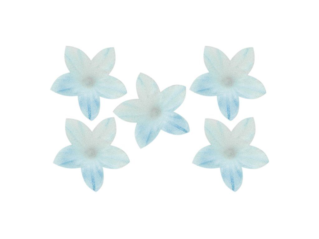 Dekorace z jedlého papíru, tvar květ, modrobílá barva, průměr 2 cm, balení 20 ks, bez lepku, laktózy a přidaného cukru, ideální na zdobení dortů nebo cupcaků.