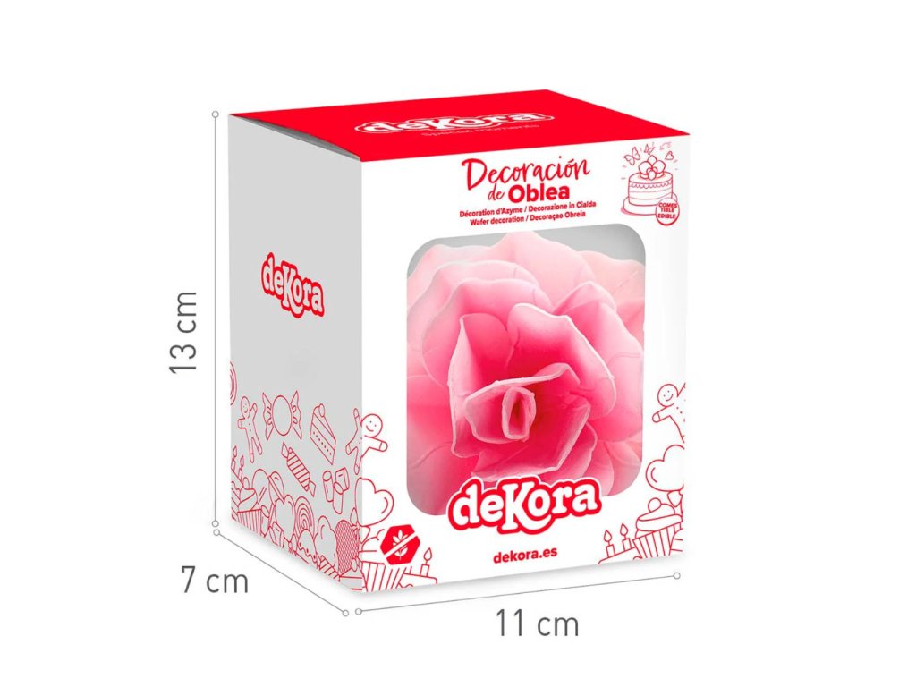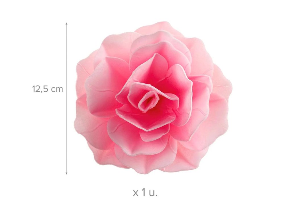 Velký květ z jedlého papíru o průměru 12,5 cm. Elegantní růžová růže působí luxusně a dodá dezertům slavnostní vzhled během okamžiku. Díky lehké konstrukci dekorace nezatěžuje povrch dortu a perfektně drží tvar.