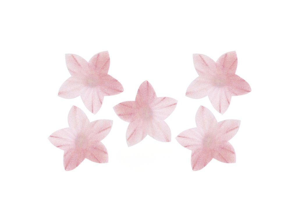 Dekorace z jedlého papíru, tvar květ, růžová barva, průměr 2 cm, balení 20 ks, bez lepku, laktózy a přidaného cukru, ideální na zdobení dortů nebo cupcaků.