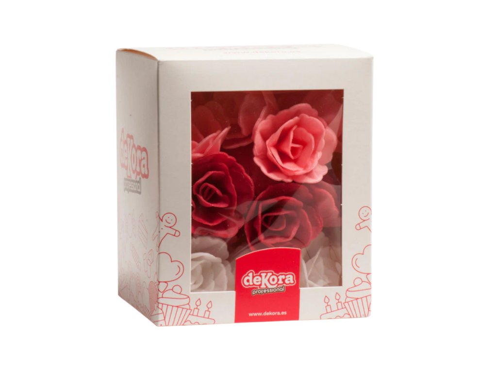 Hotová jedlá dekorace ve tvaru růže, určená k rychlému a efektivnímu zdobení dortů a dezertů. Sada obsahuje 36 kusů bílých, růžových a červených růží o průměru cca 4,5 cm.
