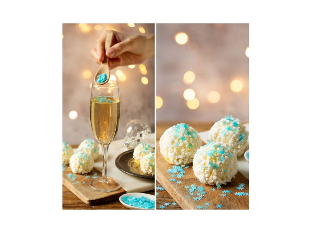 Jedlé dekorační vločky Decora dodají vašim výtvorům realistický ledový efekt. Cukrové vločky o průměru cca 0,6 cm se snadno sypou na dorty, cupcaky, sušenky i do drinků.