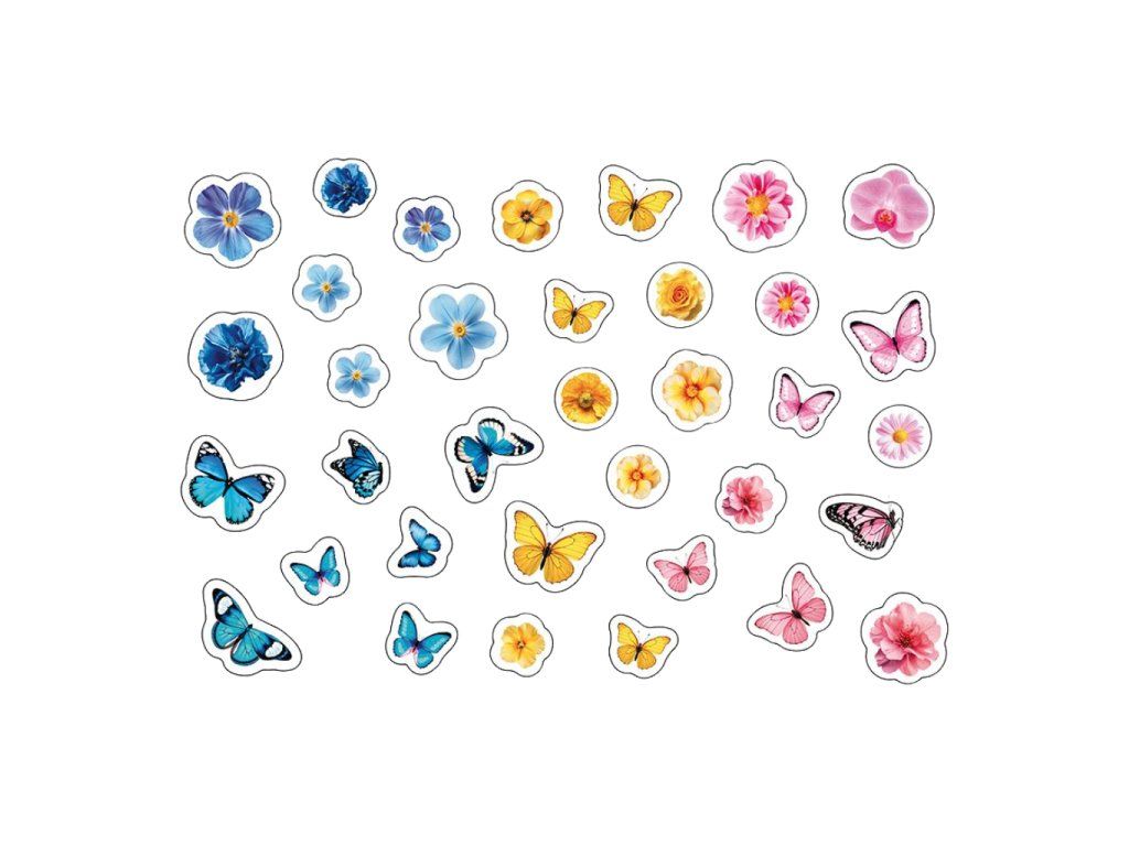 Škrobové nálepky, balení 1 arch, motiv motýlků a květů, připravené k okamžitému použití, vhodné na dekorování dortů a dezertů.