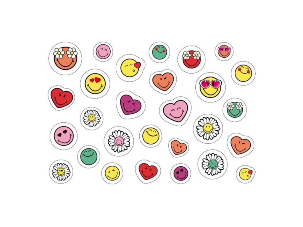 Škrobové nálepky, balení 1 arch, motiv smajlíků, připravené k okamžitému použití, vhodné na dekorování dětských dortů a dezertů.