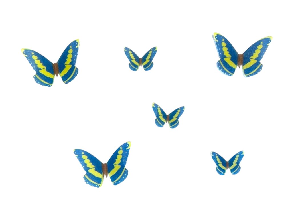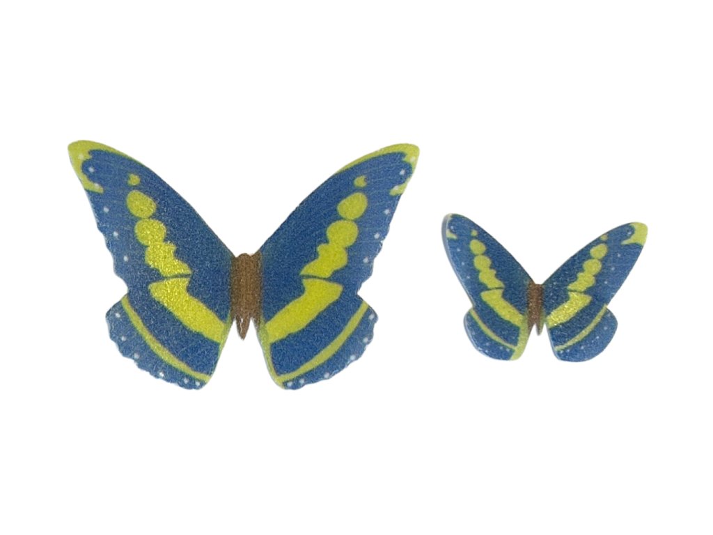Motýlci z jedlého papíru – modrá barva, balení po 6ks, rozměry 4 a 7 cm.