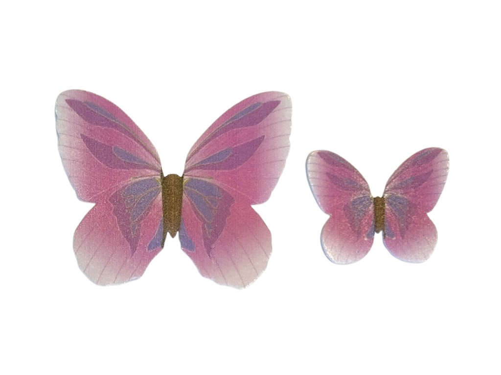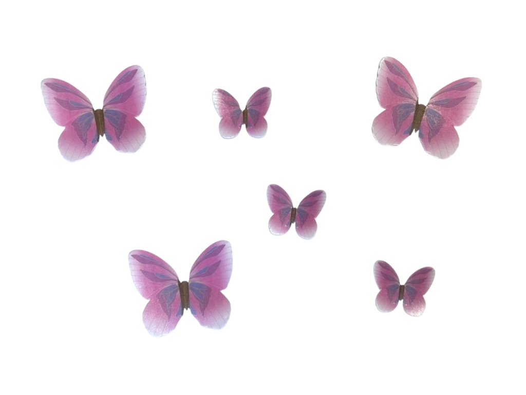 Motýlci z jedlého papíru – růžová barva, balení po 6ks, rozměry 4 a 7 cm.