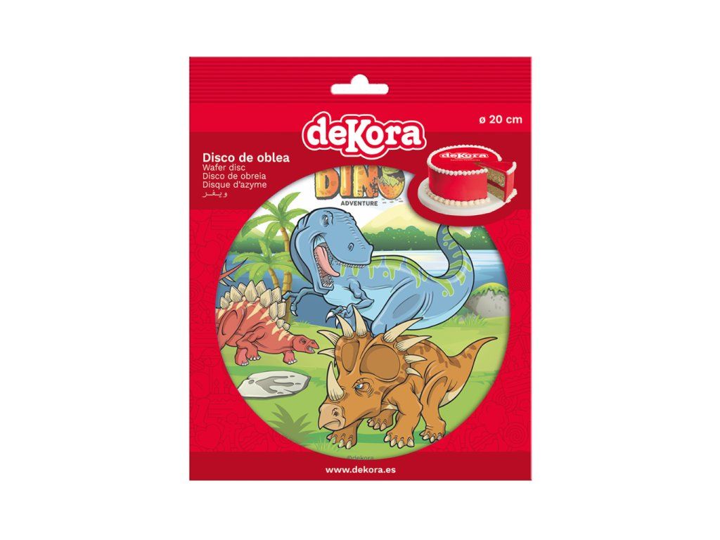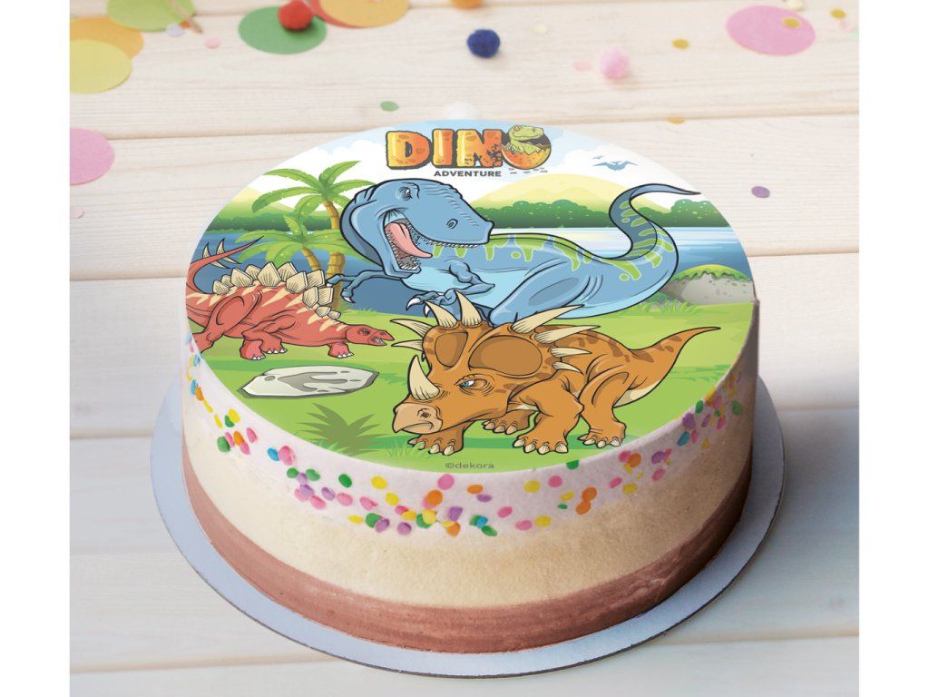 Dekorace z jedlého papíru na dort, motiv dinosaurus, tvar kruh, průměr 20 cm, bez lepku, bez laktózy, bez přidaného cukru.